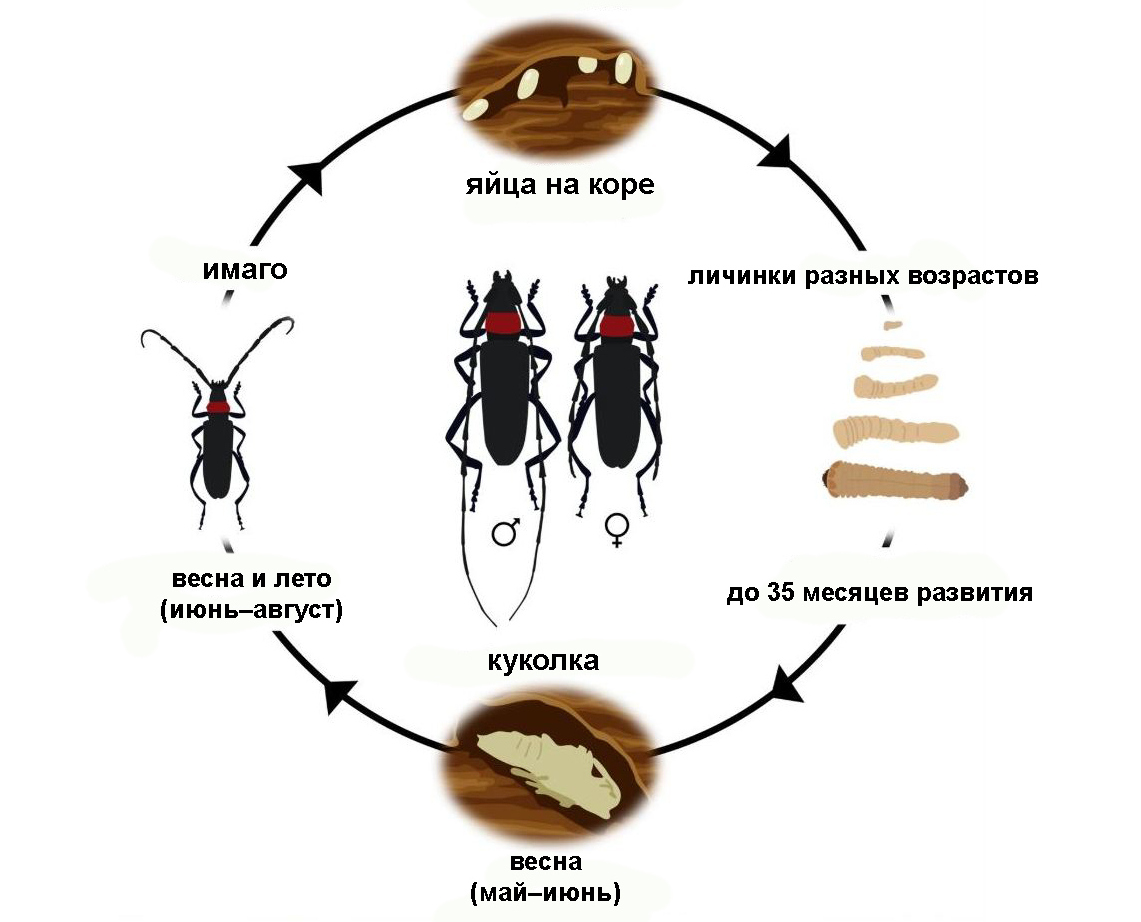 Жизненный цикл красношейного усача. У мускусного усача он похожий. Рисунок из статьи K. J. Horrocks et al., 2024. Biology, impact, management and potential distribution of Aromia bungii, a major threat to fruit crops around the world