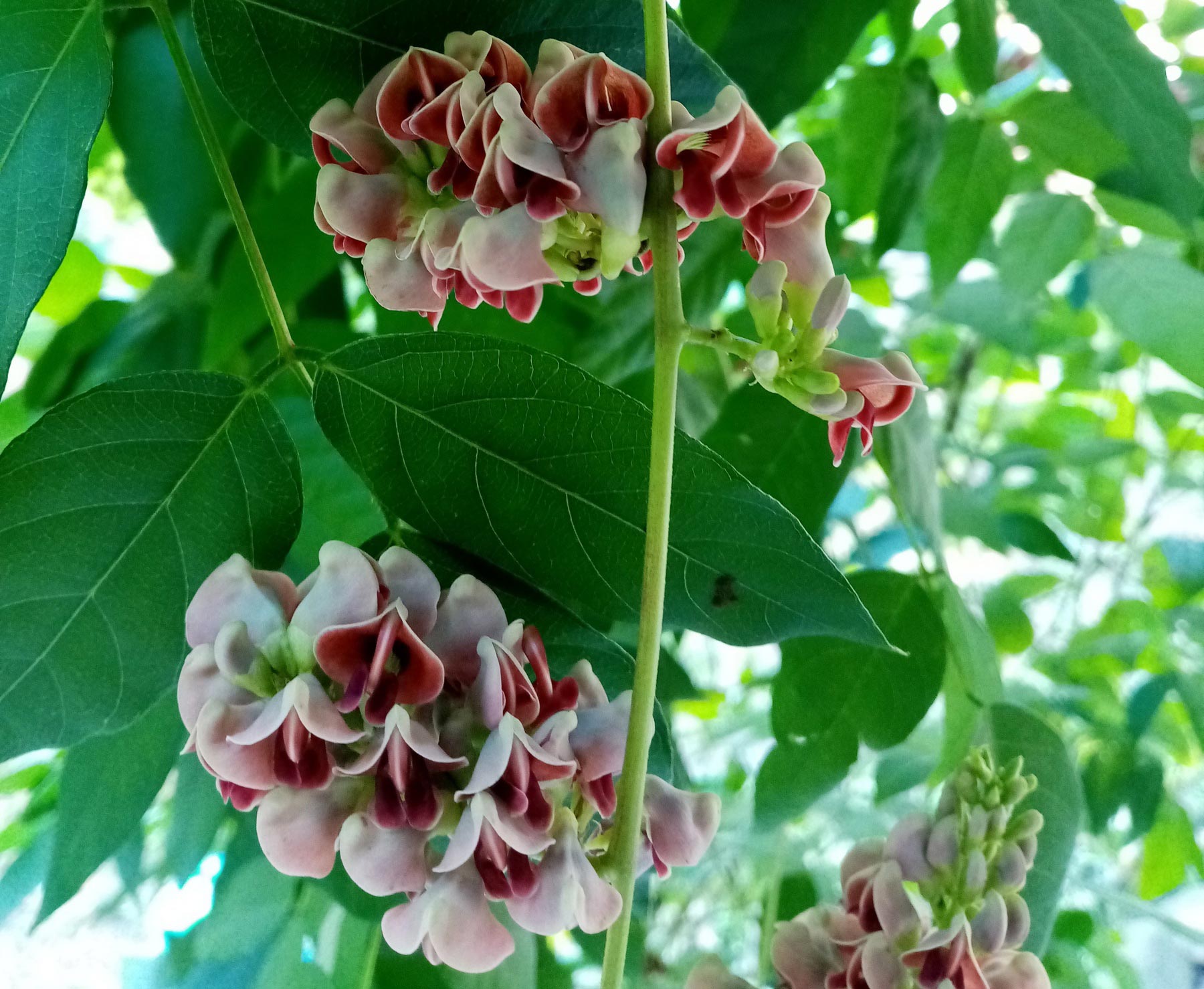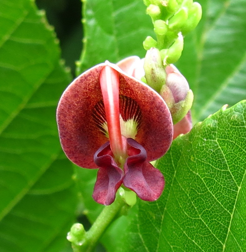 На фото — соцветия многолетней травянистой лианы под названием апиос американский (Apios americana). По внешнему виду цветков можно догадаться о принадлежности растения к семейству бобовых. Их венчик состоит из пяти характерных лепестков: широкого флага (паруса), двух крыльев (весел) и лодочки из двух сросшихся лепестков. Такой венчик за сходство с мотыльком называют мотыльковым.