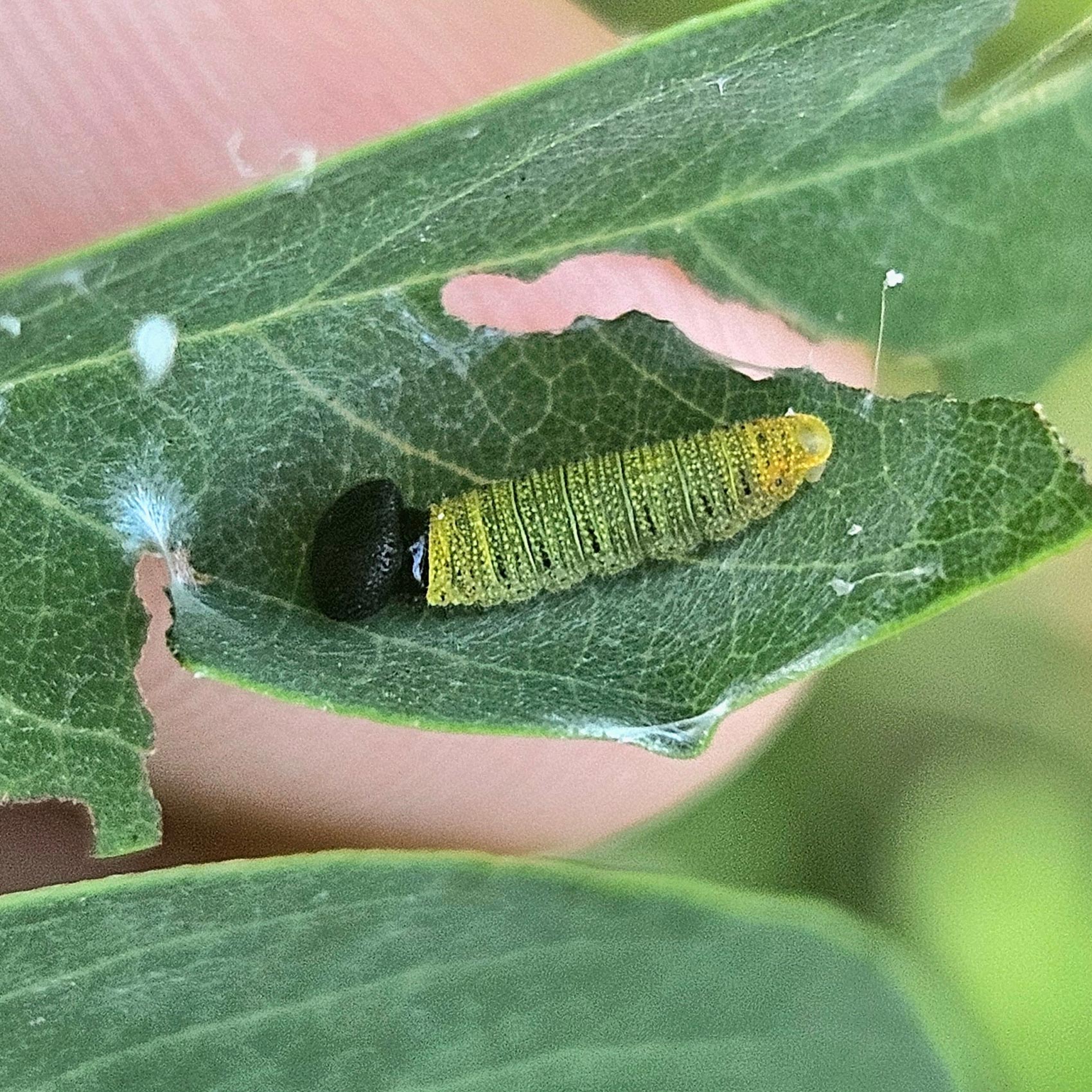 Гусеница младшего возраста в процессе строительства убежища. Фото © Bade с сайта inaturalist.org, Канада, 27 сентября 2025 года