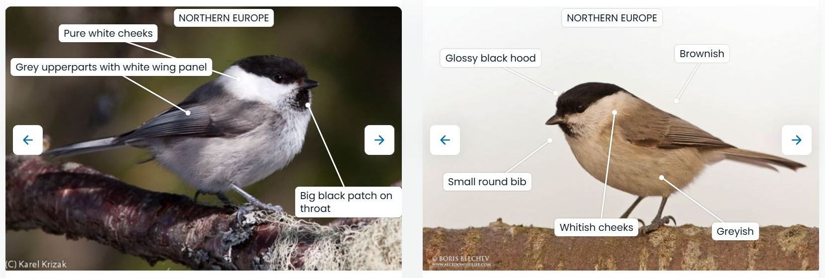 Внешние различия пухляка (слева) и черноголовой гаички. У пухляка белая щека (pure white cheeks), верх тела буровато-серый, низ беловатый, черное горловое пятно большое, заходит на грудь (big black patch on throat), светлая полоса на сложенном крыле (grey upperparts with white wing panel). У черноголовой гаички (справа) блестящая черная шапочка (glossy black hood), горловое пятно маленькое (small round bib), щека грязно-белая (whitish cheecks), низ тела серовато-бурый (greyish). Фото с сайта birdid.no