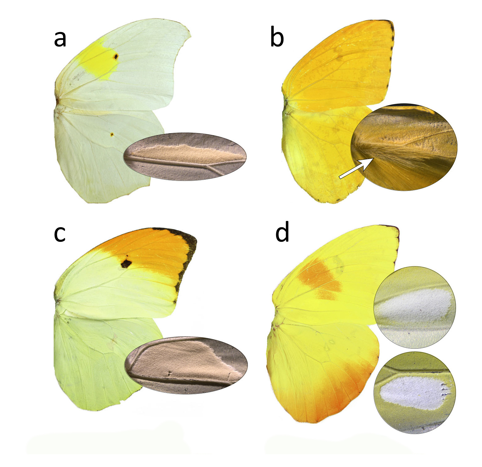 Верхняя поверхность крыльев бразильских видов бабочек подсемейства желтушек: a — Anteos clorinde; b — Phoebis argante, c — A. menippe; d — P. philea. Во врезках показаны поля андрокониев, резко отличающиеся от окружающей массы чешуек. Стрелка указывает на волосовидные чешуйки под андрокониями. Фото из статьи C. E. B. Nobre et al., 2021. Specialized androconial scales conceal species-specific semiochemicals of sympatric sulphur butterflies (Lepidoptera: Pieridae: Coliadinae)