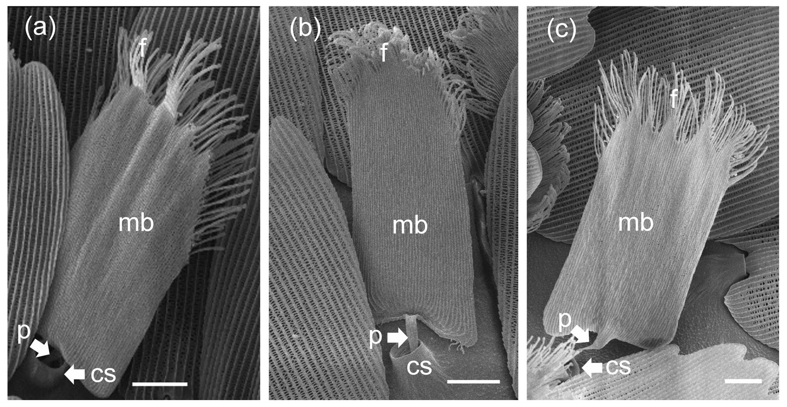 Отдельные андрокониальные чешуйки трех видов бабочек-геликонид под электронным микроскопом: f — бахрома, обрамляющая верхнее отверстие; p — стебелек; cs — мешочек чешуйки; mb — верхняя пластинка чешуйки. Длина масштабного отрезка — 10 мкм. Фото из статьи E. de Oliveira Borges et al., 2020. Structures related to pheromone storage in alar androconia and the female abdominal scent gland of Heliconius erato phyllis, Heliconius ethilla narcaea, and Heliconius besckei (Lepidoptera: Nymphalidae: Heliconiinae)