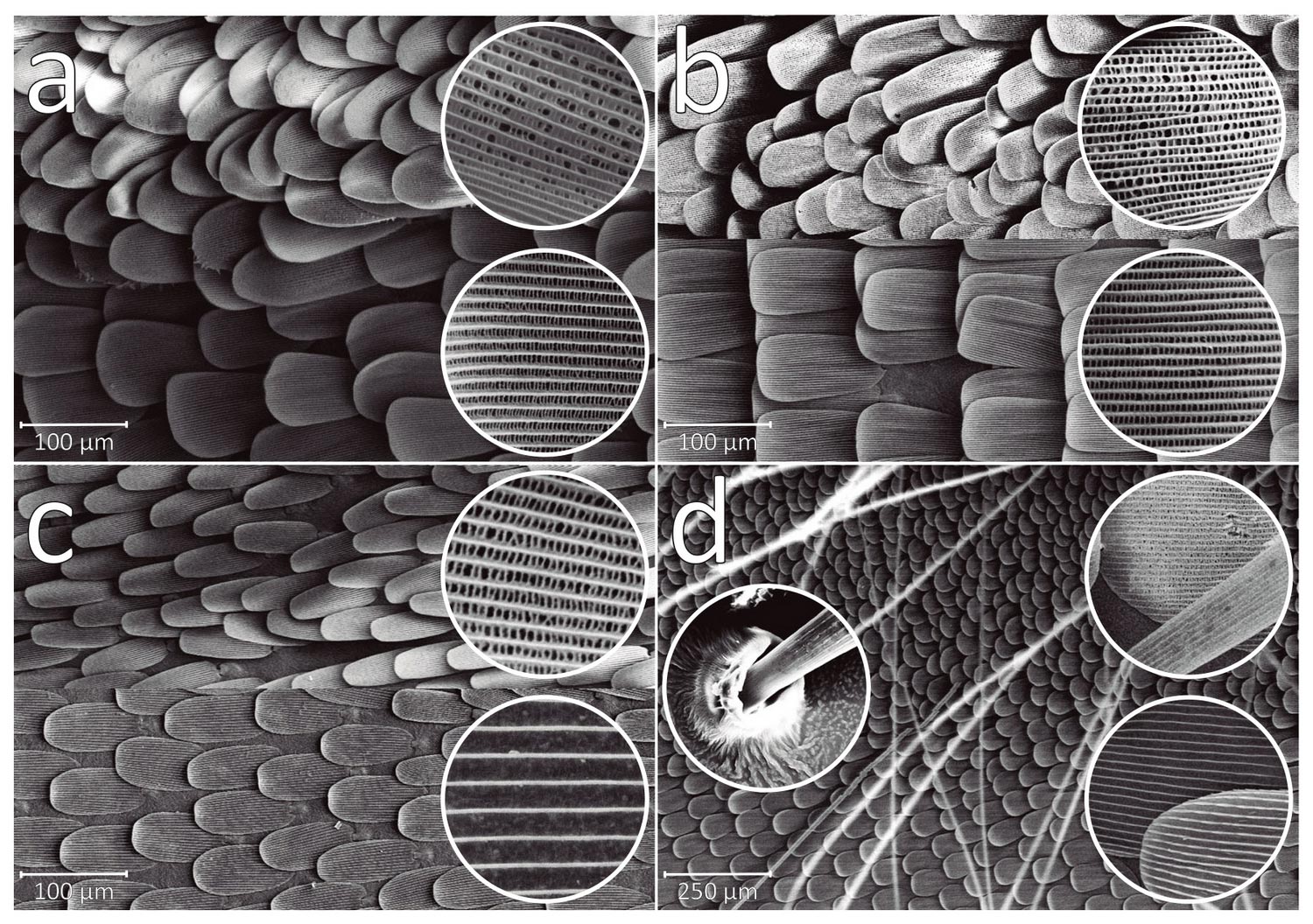 Чешуйки на крыльях бразильских бабочек подсемейства желтушек в электронном микроскопе: a — Anteos clorinde; b — A. menippe; c — Phoebis marcellina; d — P. argante. Андроконии показаны над обычным чешуйками. Во врезках при увеличении в 2500 (a, b, d) и 5000 крат (c) показаны детали строения верхней пластинки: гребни, ребрышки и перфорации. Фото из статьи C. E. B. Nobre et al., 2021. Specialized androconial scales conceal species-specific semiochemicals of sympatric sulphur butterflies (Lepidoptera: Pieridae: Coliadinae)