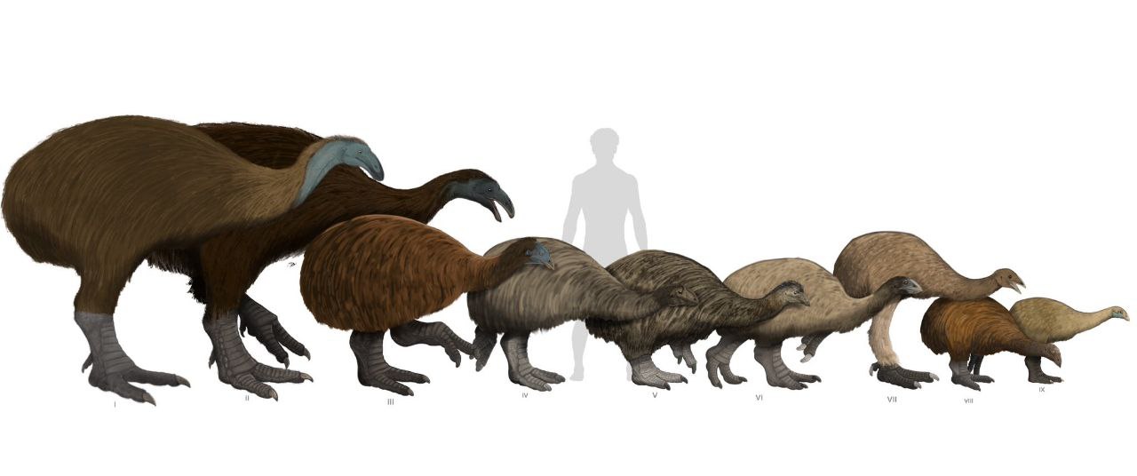 Известные виды моа в сравнении с человеком: I — Dinornis robustus; II — большой моа (Dinornis novaezealandiae); III — Pachyornis elephantopus; IV — южный моа (Euryapteryx curtus); V — Pachyornis australis; VI — Emeus crassus; VII — лесной малый моа (Megalapteryx didinus); VIII — Pachyornis geranoides; IX — Anomalopteryx didiformis. Рисунок с сайта x.com
