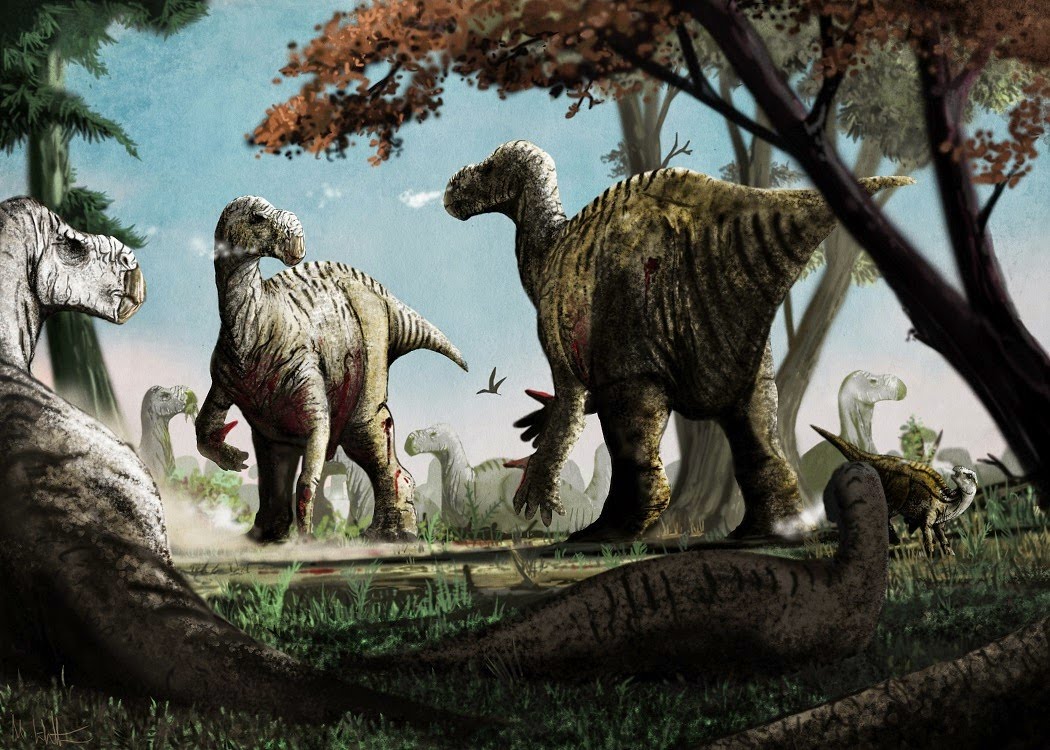 Эта пара игуанодонов пустила свои шипы в ход, пока остальные члены стада наблюдают за их спором. Рисунок © Mark Witton с сайта markwitton-com.blogspot.com