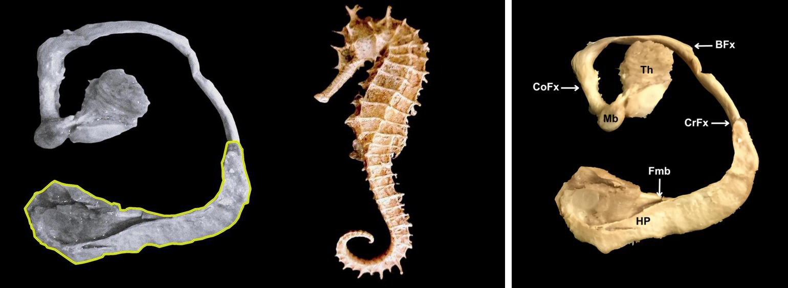 Слева — сравнение гиппокампа и морского конька; гиппокамп выделен желтым цветом. Справа — гиппокамп и свод мозга, которые в совокупности больше напоминают морского конька, чем гиппокамп сам по себе: HP — гиппокамп, Fmb — пучки волокон, которые затем образуют ножки свода (CrFx), BFx — тело свода, CoFx — столб свода, Mb — сосцевидное тело, Th — таламус. Изображения из статьи J. Duque-Colorado et al., 2025. Hippocampus and cornu ammonis: mythonyms that prevail in Terminologia Anatomica, Terminologia Neuroanatomica, and Terminologia Histologica
