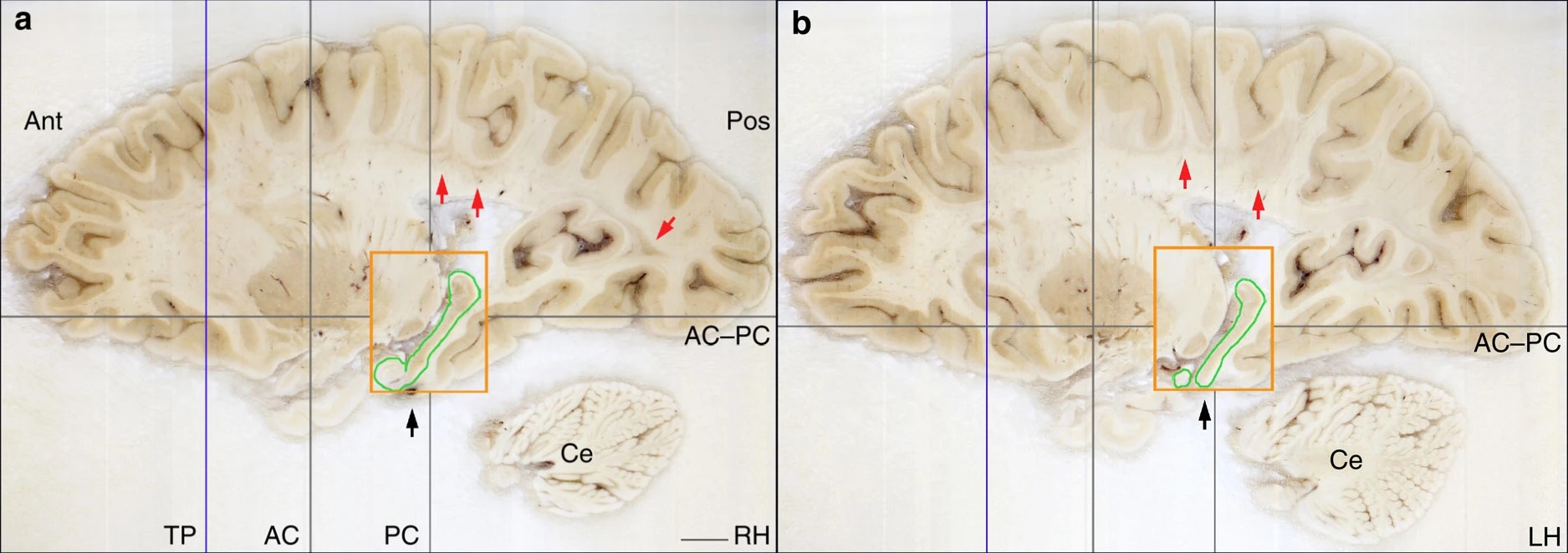 Срезы правого (a) и левого (b) полушарий мозга Г.М. Оранжевый прямоугольник ограничивает часть неповрежденного гиппокампа (выделена зеленым). Изображение из статьи J. Annese et al., 2014. Postmortem examination of patient H.M.’s brain based on histological sectioning and digital 3D reconstruction
