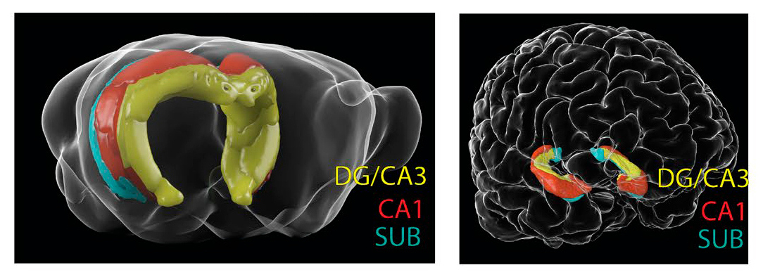 Трехмерные реконструкции гиппокампа мыши (слева) и человека, показывающие относительное расположение зубчатой извилины и области гиппокампа CA3 (DG/CA3, желтый), области гиппокампа CA1 (красный) и субикулюма (SUB, голубой). Изображения из статьи M. S. Bienkowski et al., 2021. Homologous laminar organization of the mouse and human subiculum