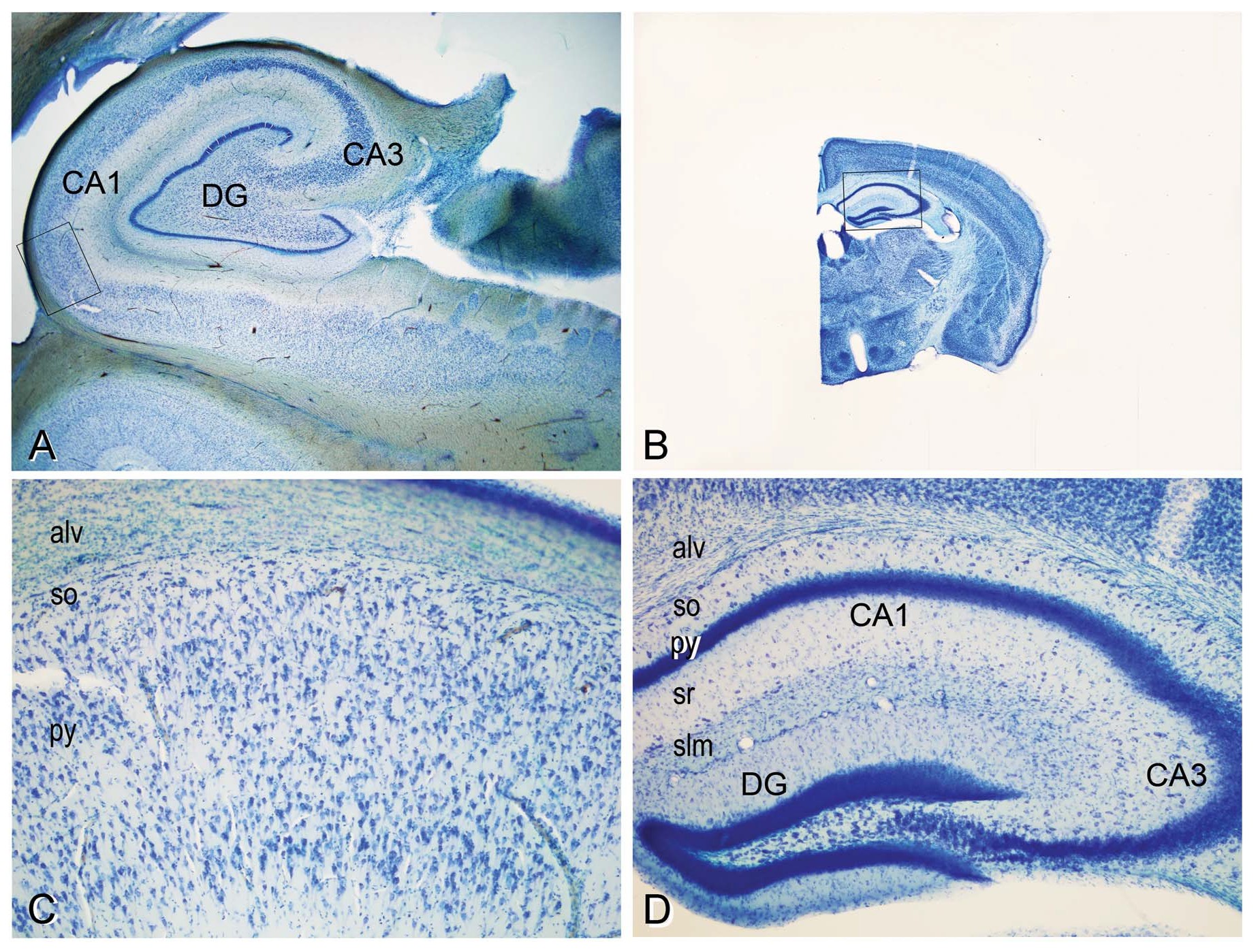 Сравнение строения гиппокампа человека и мыши под микроскопом. На рисунках A и B показаны срезы мозга человека и мыши, окрашенные по Нисслю, при одинаковом увеличении — хорошо видно, насколько различаются размеры мозга. На C и D приведены увеличенные фрагменты этих срезов, соответствующие области CA1 гиппокампа. На D обозначены слои гиппокампа: so — stratum oriens; py — stratum pyramidale; sr — stratum radiatum; slm — stratum lacunosum-moleculare. DG — зубчатая извилина. Иллюстрация из статьи R. Benavides-Piccione et al., 2020. Differential structure of hippocampal CA1 pyramidal neurons in the human and mouse