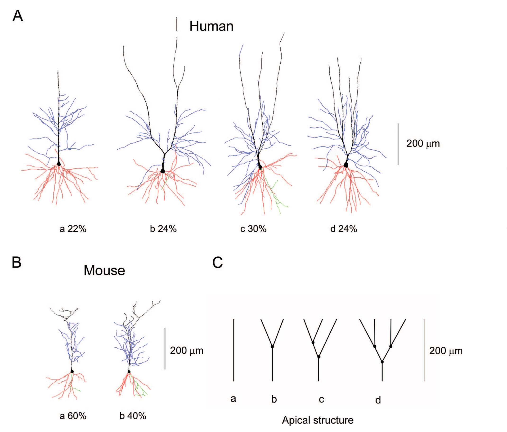 Пирамидные нейроны области CA1 гиппокампа человека (A) и мыши (B), реконструированные в 3D и показанные в одном масштабе. Черным цветом обозначен главный апикальный дендрит, синим — его боковые ветви, красным — базальные дендриты, зеленым — аксон (если он был восстановлен). Представленные клетки иллюстрируют разные типы ветвления главного апикального дендрита; указанные проценты показывают, как часто такие типы встречаются в выборке. C — схема основных вариантов ветвления: a — без разветвлений, b — одно, c — два, d — три разветвления в пределах первых 200 мкм от тела клетки. Иллюстрация из статьи R. Benavides-Piccione et al., 2020. Differential structure of hippocampal CA1 pyramidal neurons in the human and mouse