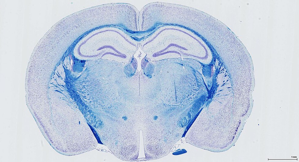 Фронтальный срез мозга мыши, окрашенный гематоксилином и LFB. Фото с сайта commons.wikimedia.org