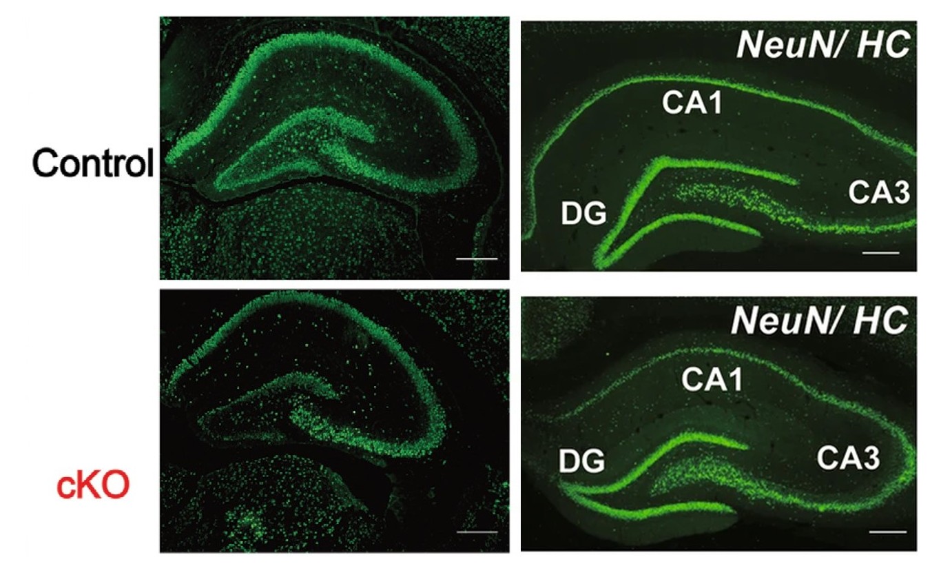 Примеры окраски NeuN (зеленое свечение) в гиппокампе контрольных (Control) и модельных для шизофрении мышей (cKO). Слева — у мышей с «выключенным» геном Zfp804a уменьшается число NeuN-позитивных нейронов. Длина масштабного отрезка — 200 мкм. Изображение из статьи Q. Zhang et al., 2024. Schizophrenia-Like Deficits and Impaired Glutamate/Gamma-aminobutyric acid Homeostasis in Zfp804a Conditional Knockout Mice. Справа — у мышей с «выключенным» геном Gabrb2 гиппокамп выглядит структурно сохранным при окраске на NeuN. Длина масштабного отрезка — 300 мкм. Изображение из статьи R. K. Yeung et al., 2018. Gabrb2-knockout mice displayed schizophrenia-like and comorbid phenotypes with interneuron–astrocyte–microglia dysregulation