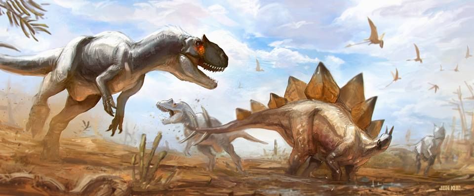 На картинке запечатлена пара самых узнаваемых динозавров поздней юры: завязшего в грязи стегозавра обступила группа хищных аллозавров, и хотя добыче деваться некуда, это не означает, что она сдастся без боя! Подобная сцена действительно могла произойти, по крайней мере так звучит одно из объяснений появления «Юрского национального памятника» (см. Jurassic National Monument) — громадного скопления из более чем 15 тысяч костей, обнаруженного в штате Юта, США. Во время суровой засухи животные приходили в это место в поисках воды, и некоторые могли застревать в вязкой грязи, после чего либо умирали от голода и жажды, либо становились жертвами хищников. Впрочем, даже обездвиженный стегозавр наверняка был грозным противником, и аллозаврам стоило соблюдать осторожность. Наибольшую опасность представлял хвост, вооруженный тагомайзером — набором из четырех длинных шипов, встречающимся только у стегозавров.