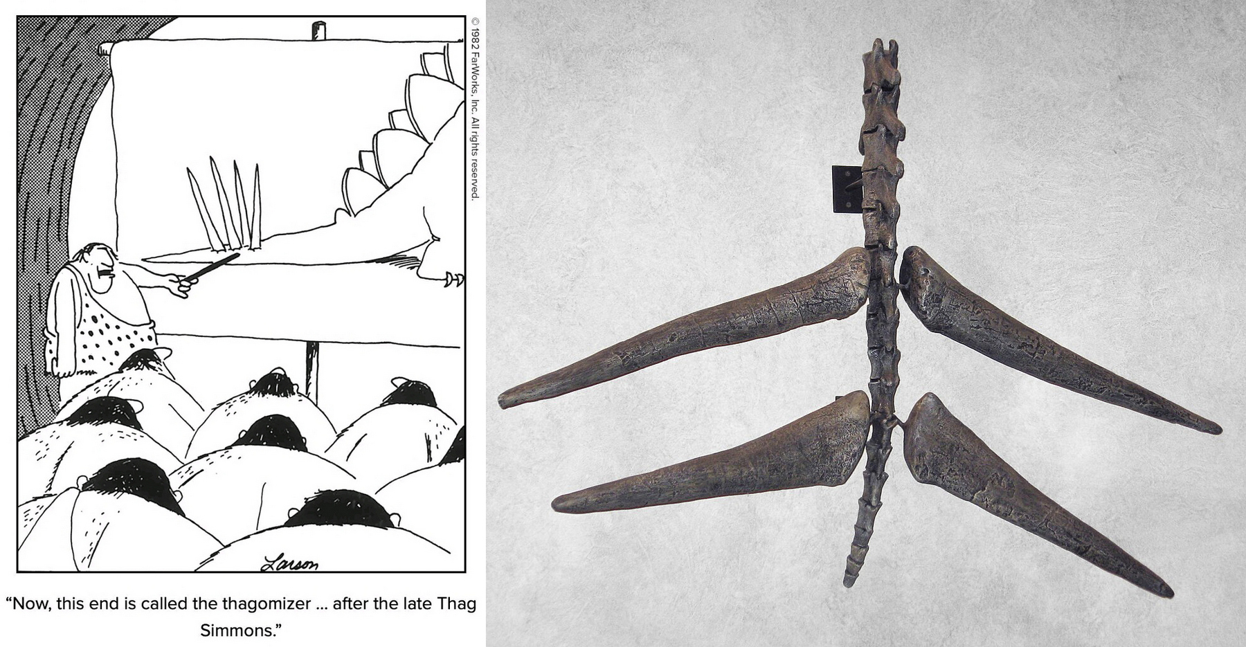 Слева — выпуск комикса Гэри Ларсона 1982 года, с сайта reddit.com. Справа — тагомайзер стегозавра в Денверском музее природы и науки, фото с сайта commons.wikimedia.org