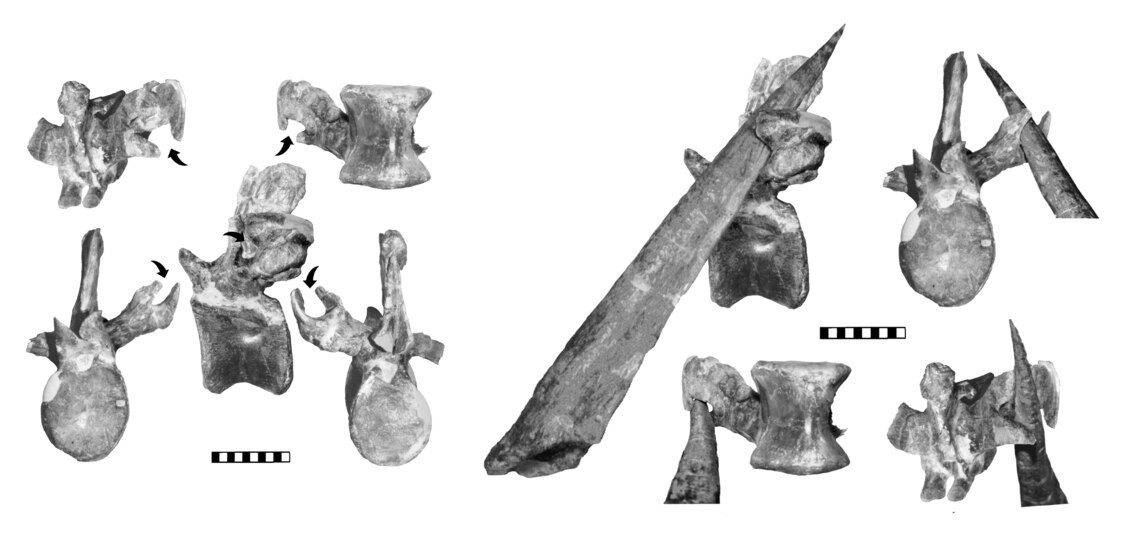 И у палеонтологов имеются доказательства, что именно такие травмы тагомайзер мог нанести! В 2005 году была опубликована работа, в которой описывался позвонок крупного аллозавра (его длина оценивалась примерно в 11 метров) с дырой в боковом отростке диаметром около 4 сантиметров. Эта дыра была оставлена неким острым продолговатым объектом, и шип тагомайзера подходил по всем параметрам, так что травмированный позвонок стал одним из немногих прямых доказательств взаимодействия стегозавров и аллозавров.