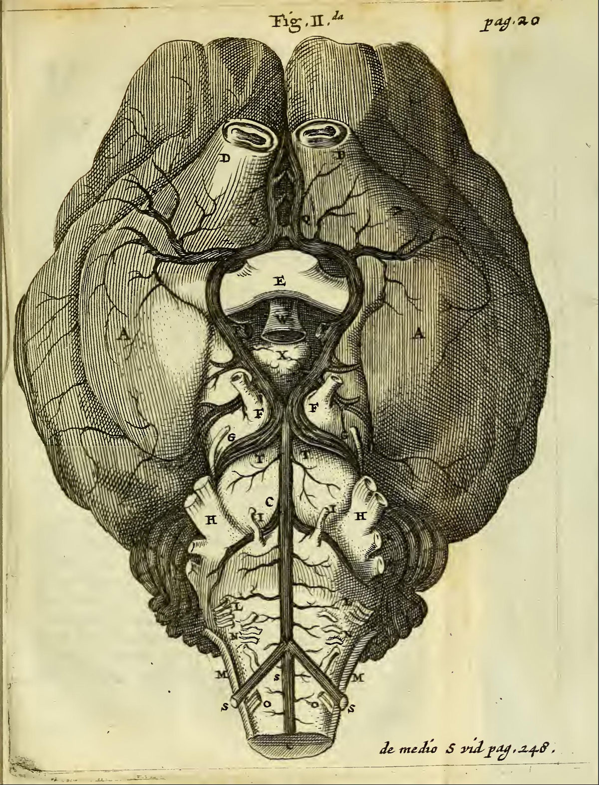 Это — головной мозг человека, вид снизу. Помимо ствола мозга, тут видны полушария, перекрест зрительных нервов, воронка гипофиза и ряд других структур. Черепные нервы изображены очень тщательно — Уиллис совершенно правильно описал большинство из них (11 пар из 12). Отдельный интерес представляет расположенное под мозгом сосудистое кольцо. Несколько упрощая, можно сказать, что головной мозг снабжают кровью две пары артерий — внутренние сонные артерии и позвоночные артерии. Ветви правой и левой внутренних сонных артерий сливаются впереди и позади гипофиза, образуя замкнутый круг. Сзади в этот круг впадает основная артерия мозга, которая, в свою очередь, образуется из слияния правой и левой позвоночных артерий. Таким образом все четыре главные артерии мозга объединяются в артериальный круг, который в честь Уиллиса называют виллизиевым кругом. Уиллис не только описал его (правда, не первым), но и догадался, зачем он нужен.