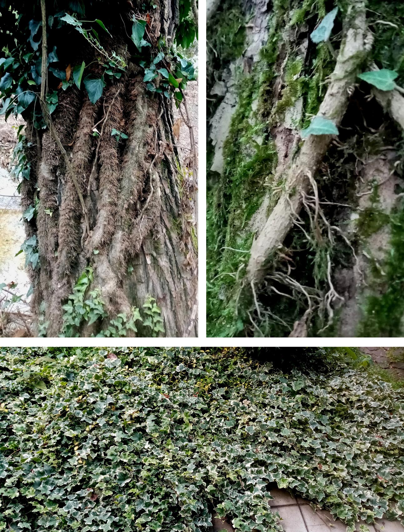 Побеги плюща на деревьях. Слева — взрослый плющ; справа — молодой. Внизу — пестролистная форма в качестве почвопокровного растения. Фото Татьяны Натальиной, Краснодарский край, октябрь 2025 года