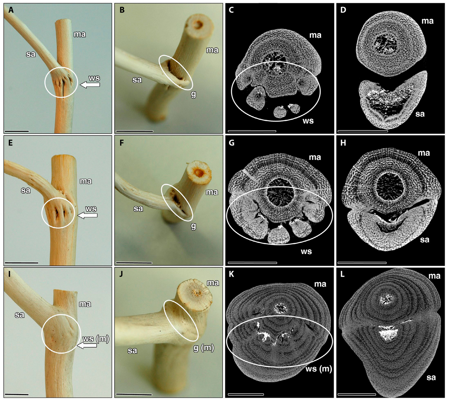 Морфология типов ветвления плюща с разной степенью слияния одревесневающих сосудистых пучков: у стелющихся побегов (A–D), лазающих вегетативных (E–H) и прямостоячих генеративных (I–L). Слева — вид на образцы сбоку и сверху, справа — микрокомпьютерная томография поперечных срезов в базальной части разветвления с древесными тяжами, выходящими из главной оси (C, G, K), и в апикальной части (D, H, L), где древесные тяжи сливаются с боковой осью. Обозначения: ma — главная ось; sa — боковая ось; ws — древесные тяжи (одревесневшие сосудистые пучки); ws (m) — слившиеся древесные тяжи; g — зазор между главной осью и боковой осью; g (m) — слияние главной и боковой осей. Длина масштабных отрезков — 5 мм. Фото из статьи K. Bunk et al., 2019. Branching morphology and biomechanics of ivy (Hedera helix) stem-branch attachments