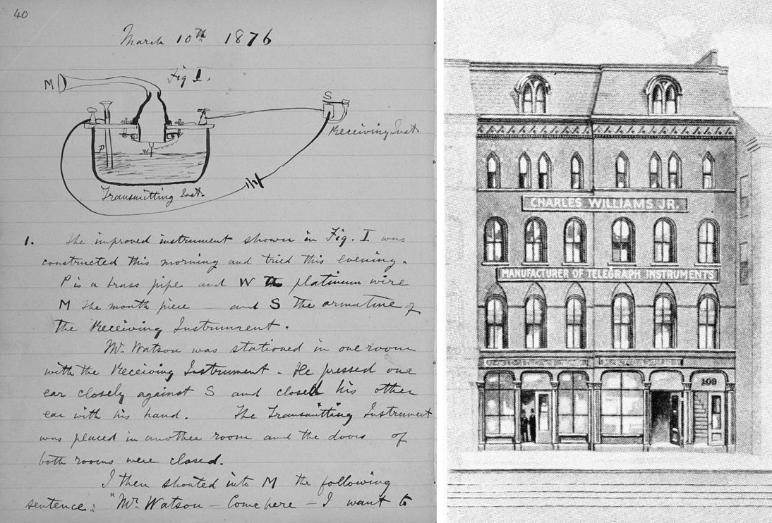 Слева — страница из лабораторного дневника Белла с изображением жидкостного передатчика и описанием эксперимента 10 марта 1876 года. Фото с сайта commons.wikimedia.org. Справа — здание, в котором Белл и Уотсон провели этот эксперимент. Рисунок из стенограммы доклада Уотсона «Рождение и младенчество телефона» (The birth and babyhood of the telephone), сделанного им в Чикаго в 1913 году на Третьем ежегодном съезде Американского общества первопроходцев телефонии (см. Pioneers, a Volunteer Network)