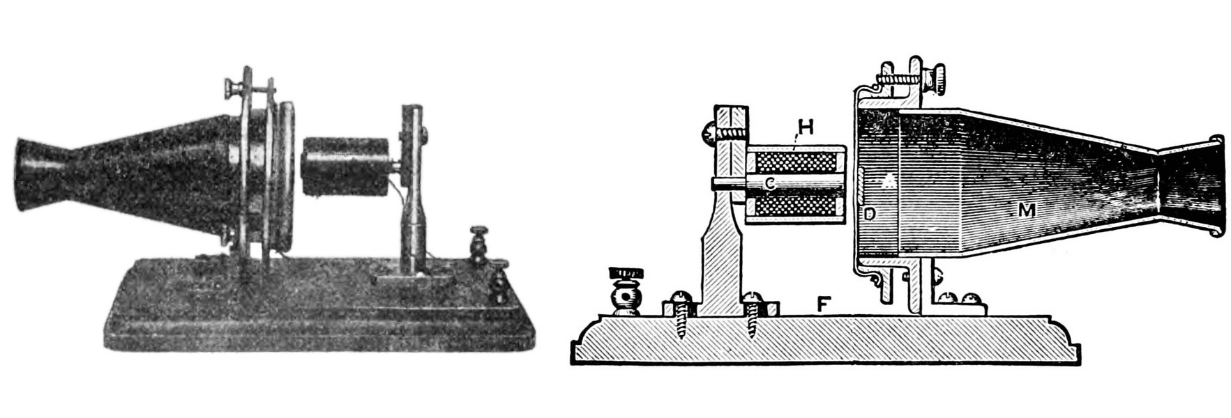 Слева — передатчик телефона Белла, продемонстрированного на выставке 1876 года. Фото с сайта commons.wikimedia.org. Справа — чертеж в разрезе: D — металлическая мембрана, колеблющаяся под воздействием звука со стороны раструба A; C и H — сердечник и обмотка электромагнита. Рисунок с сайта habr.com