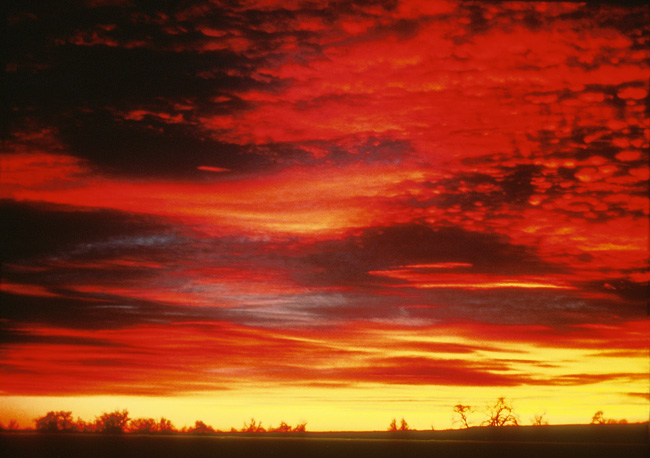 Высокослоистые облака (altostratus) располагаются на средних высотах — от 2 до 8 км — и представляют собой плотный серый, голубоватый или белесый покров, сквозь который могут проглядывать солнце или луна, как будто сквозь матовое стекло (так называемое водянистое солнце), иногда с радужными венцами. На снимке все облака окрашены в зловещий красный цвет из-за заходящего солнца.