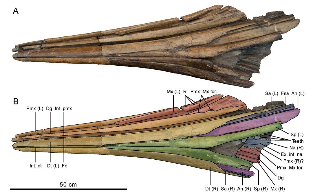 Найденный в Нижней Банновке рострум первушовизавра. Обратите внимание на Pmx-Mx. for — отверстия в нижней челюсти. Рисунок из статьи M. S Arkhangelsky et al., 2014. Simbirskiasaurus and Pervushovisaurus reassessed: implications for the taxonomy and cranial osteology of Cretaceous platypterygiine ichthyosaurs