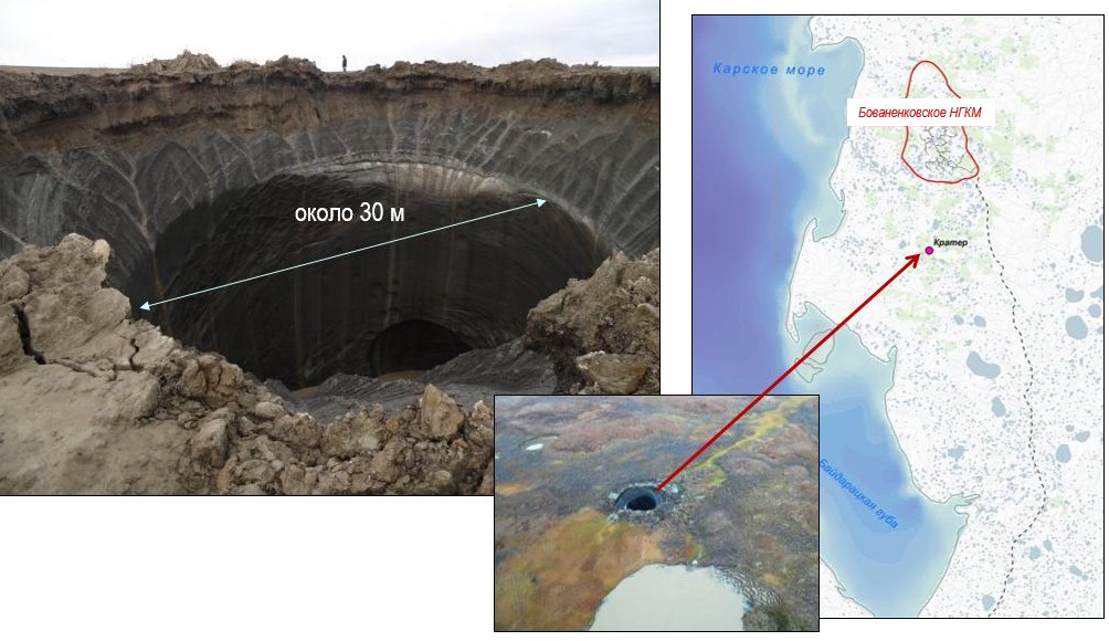 Ямальский кратер и его местоположение на карте. Фото из доклада А. А. Нежданова, А. С. Смирнова в рамках семинара по исследованию Ямальской воронки