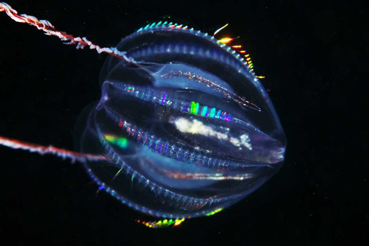 Радужные гребни мертензии. Хорошо видны гребные пластинки, или ктены, — перпендикулярные полоски на каждом из восьми продольных рядов. Фото © Александр Семёнов с сайта flickr.com