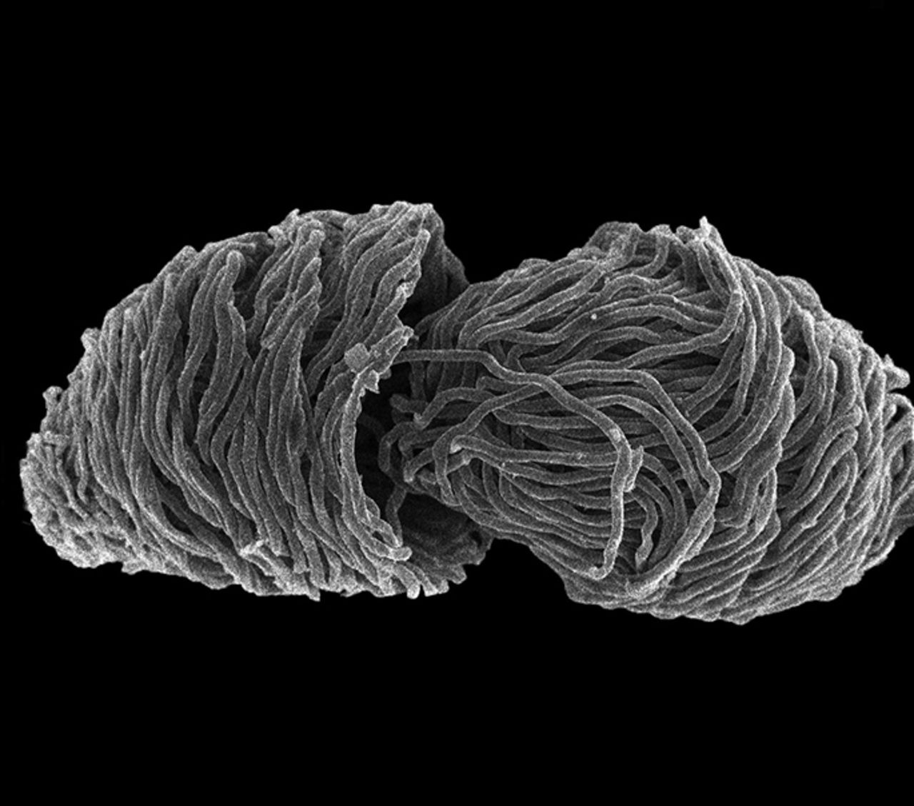 Дело как раз в этих белковых «клубках», которых в слизи большинства других животных нет (а есть только муцины). Слизистые железы миксины имеют особое строение: в каждой из них есть два типа клеток — одни производят муциновые гранулы (пузырьки диаметром 5 мкм), другие — клубки белковых нитей, схожих по составу с кератином волос.