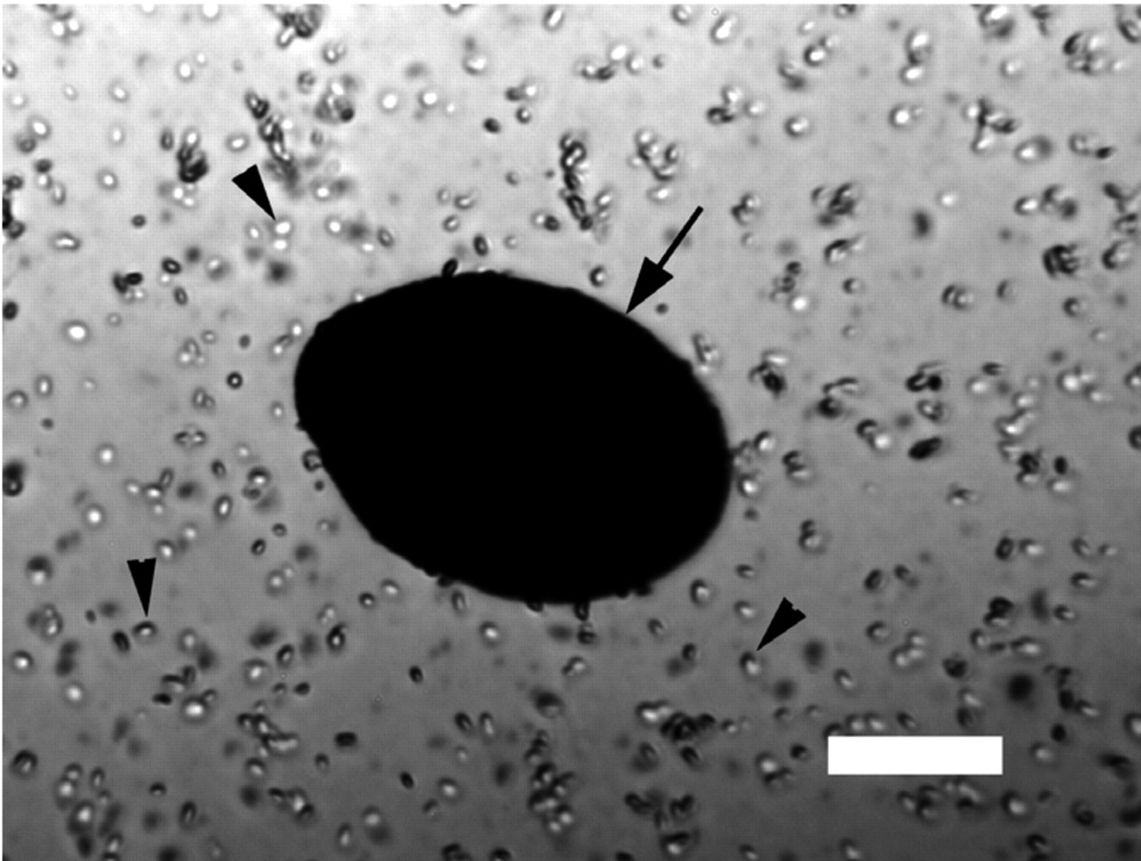 Два продукта слизистых желез миксины: муциновые гранулы (мелкие пузырьки) и клубок белковых нитей (в центре). Длина масштабной линейки — 50 мкм. Фото из статьи D. S. Fudge et al., 2005. Composition, morphology and mechanics of hagfish slime