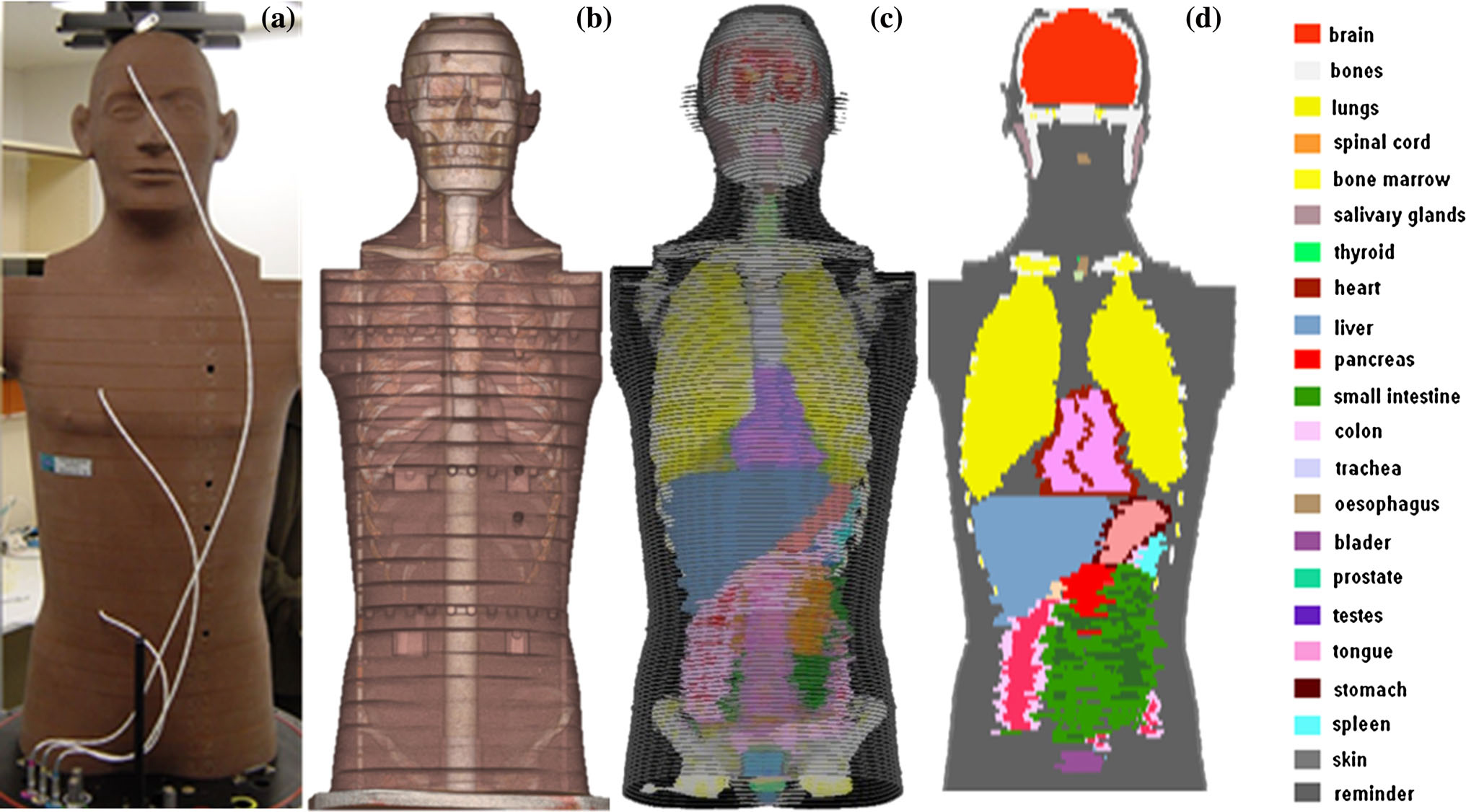 Антропоморфный фантом «Рэндо» представляет собой торс, сделанный из настоящего человеческого скелета и полиуретана, имитирующего мягкие и мышечные ткани. Высота торса — 84 см, максимальная ширина — 40 см, максимальная глубина — 22 см. А — вид спереди; b — компьютерная томография, c и d — компьютерная модель, где органы и ткани показаны разными цветами. Изображение из статьи M. Puchalska et al., 2014. NUNDO: a numerical model of a human torso phantom and its application to effective dose equivalent calculations for astronauts at the ISS