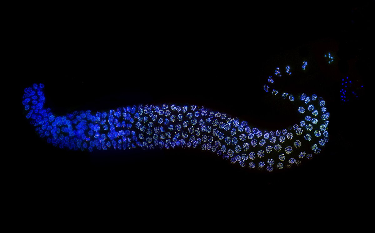 На фотографии можно подробно разглядеть некоторые стадии мейоза благодаря флуоресцентной окраске структур ядра делящихся клеток (диаметр клеточного ядра у нематод составляет 3–4 мкм). Синим окрашена непосредственно ДНК, а зеленым и красным — соответственно, белки HTP-3 и SYP-1, которые играют вспомогательную роль при делении: они помогают хромосомам правильно расходиться, сходиться и обмениваться между собой участками (этот процесс называется рекомбинацией).