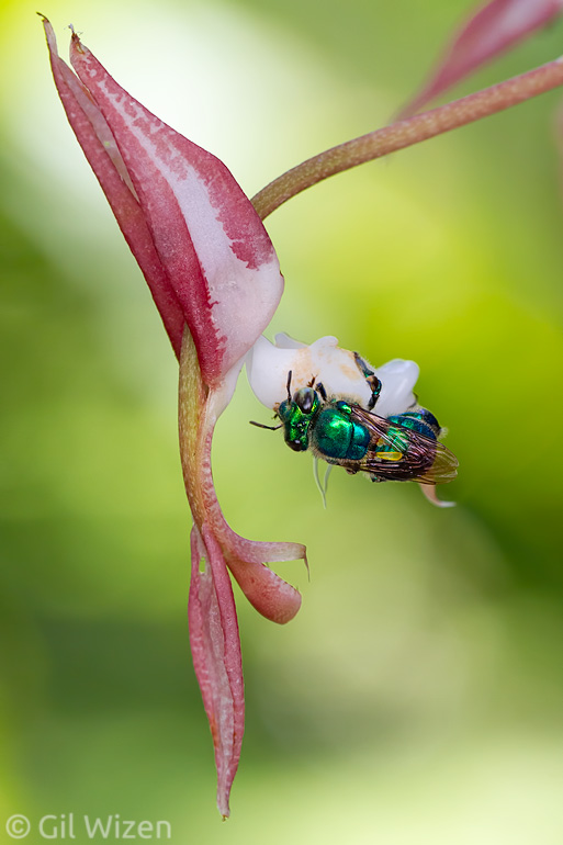 Самец пчелы Euglossa, собирающий аромат с орхидеи. Фото © Gil Wizen с сайта gilwizen.com