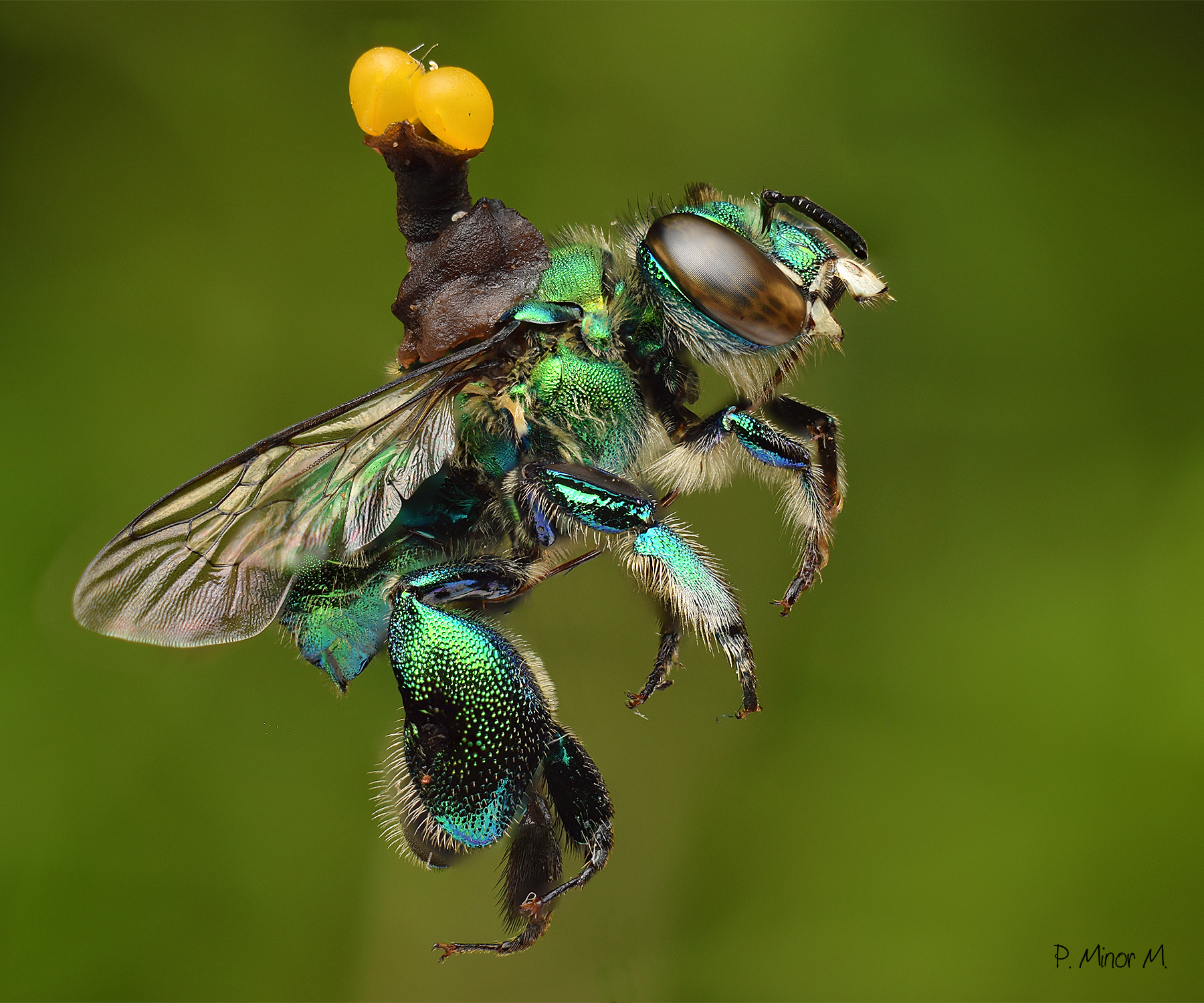 Пчела Euglossa sp. с двумя поллиниями орхидей, прилипшими к ее спине. Фото © Pablo Minor с сайта flickr.com