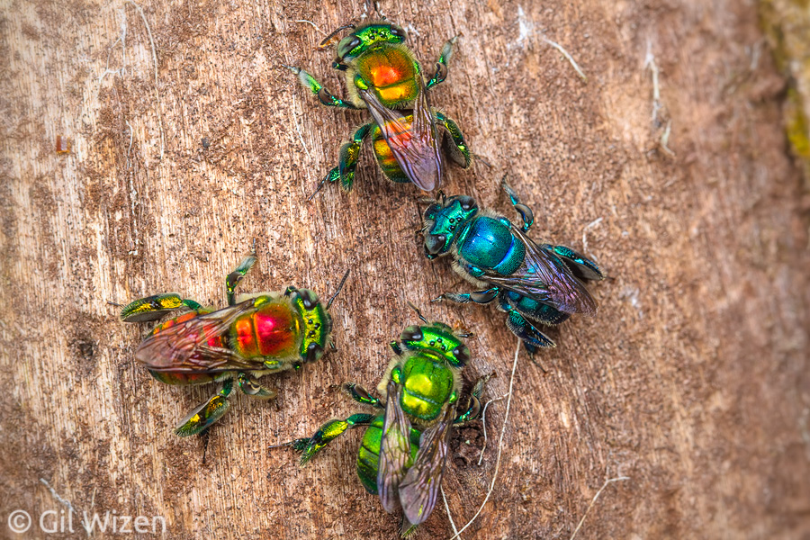 Самцы разных видов Euglossa собирают грибной запах со ствола дерева. Фото © Gil Wizen с сайта gilwizen.com