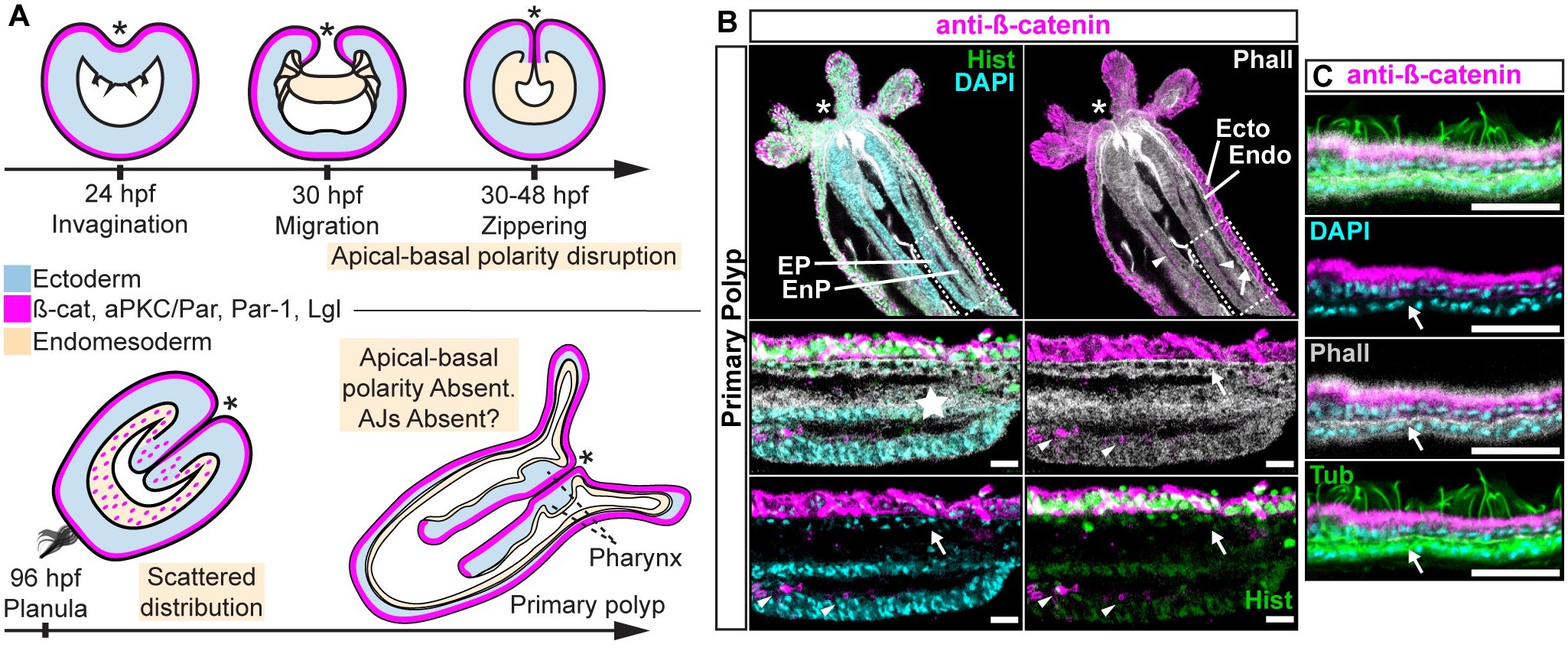 А — гаструляция и последующее образование зародышевых листков, органов и тканей у актинии N. vectensis. Бледно-розовым цветом показана хаотичная «разбросанность» клеток энтомезодермы (Endomesoderm). B — микрофотографии иммунофлюоресцентно окрашенных эмбрионов N. vectensis. Видна активность ß-катенина (сиреневый) в эктодерме и отсутствие таковой в энтомезодерме. Изображение из статьи M. Salinas-Saavedra et al., 2018. Germ layer-specific regulation of cell polarity and adhesion gives insight into the evolution of mesoderm