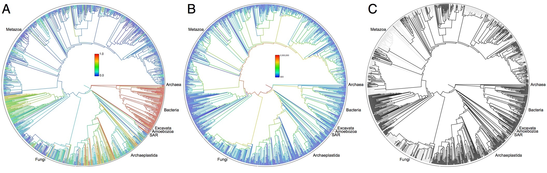 Изображенное дерево содержит линии, включающие как минимум 500 потомков. A — разными цветами показаны доли родословных, представленных в базе национального центра биотехнологической информации (NCBI). B — цветом показано биоразнообразие, оцененное по количеству конечных веточек-потомков. C — темным показаны ветки, имеющие хотя бы одного представителя в исходном дереве