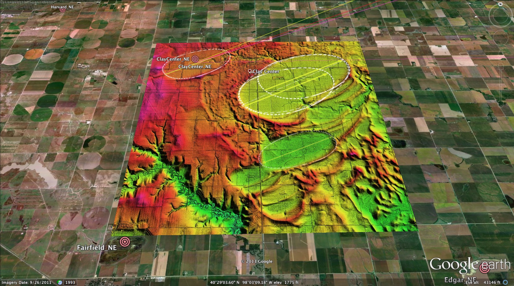 В 2001 году абсолютно аналогичные «заливам Каролины» структуры были обнаружены далеко от Атлантического побережья, в самом центре материка, в штате Небраска. С той лишь разницей, что длинные оси всех «заливов» в Небраске были ориентированы на северо-восток, то есть опять же район озера Мичиган. Стало ясно, что нужна единая гипотеза, объясняющая происхождение «заливов» обоих регионов. Возраст структур Небраски, полученный радиоуглеродным методом, составил примерно 27 тысяч лет.
