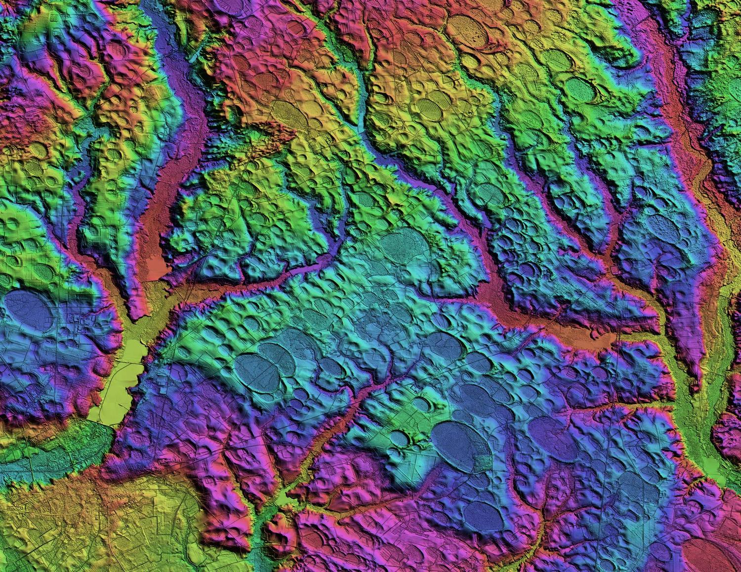 На этом фото восточного побережья США (штат Северная Каролина) отчетливо видны овальные структуры, известные под именем «заливы Каролины» (Carolina bays). Снимок сделан с помощью технологии дистанционного лазерного зондирования лидар (LIDAR), позволяющей провести высокоточные измерения 3D-координат, которые вместе с GPS-информацией о геопозиционировании преобразуются в трехмерную поверхность отражения лазерных импульсов. Лидарные снимки — это, по сути, цифровые карты высот (DEM, Digital elevation model), способные различать перепады всего в несколько десятков сантиметров. Цветами на DEM-изображениях показаны топографические высоты. Так, абсолютная отметка в правом нижнем углу составляет 16 м над уровнем моря, а в левом верхнем углу — 76 м. Обработка лидарных снимков с помощью систем машинного зрения позволяет увидеть рельеф поверхности Земли, освобожденный от внешних наслоений в виде воды, почвы, растительности и построек.