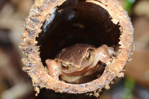 На фото — сценка из жизни амазонских джунглей: перуанский паук-птицеед Pamphobeteus sp. перешагивает через маленькую лягушку Chiasmocleis ventrimaculata из семейства узкоротов, даже не думая закусить этим сочным земноводным. Лягушки этого вида беспрепятственно проживают в норке птицееда и очень любят забираться в домик из его ног: под охраной огромного и грозного паука им не страшны многочисленные амазонские враги — рептилии и крупные членистоногие. Птицеед вполне питается другими видами лягушек, а вот своих «питомцев» не трогает.