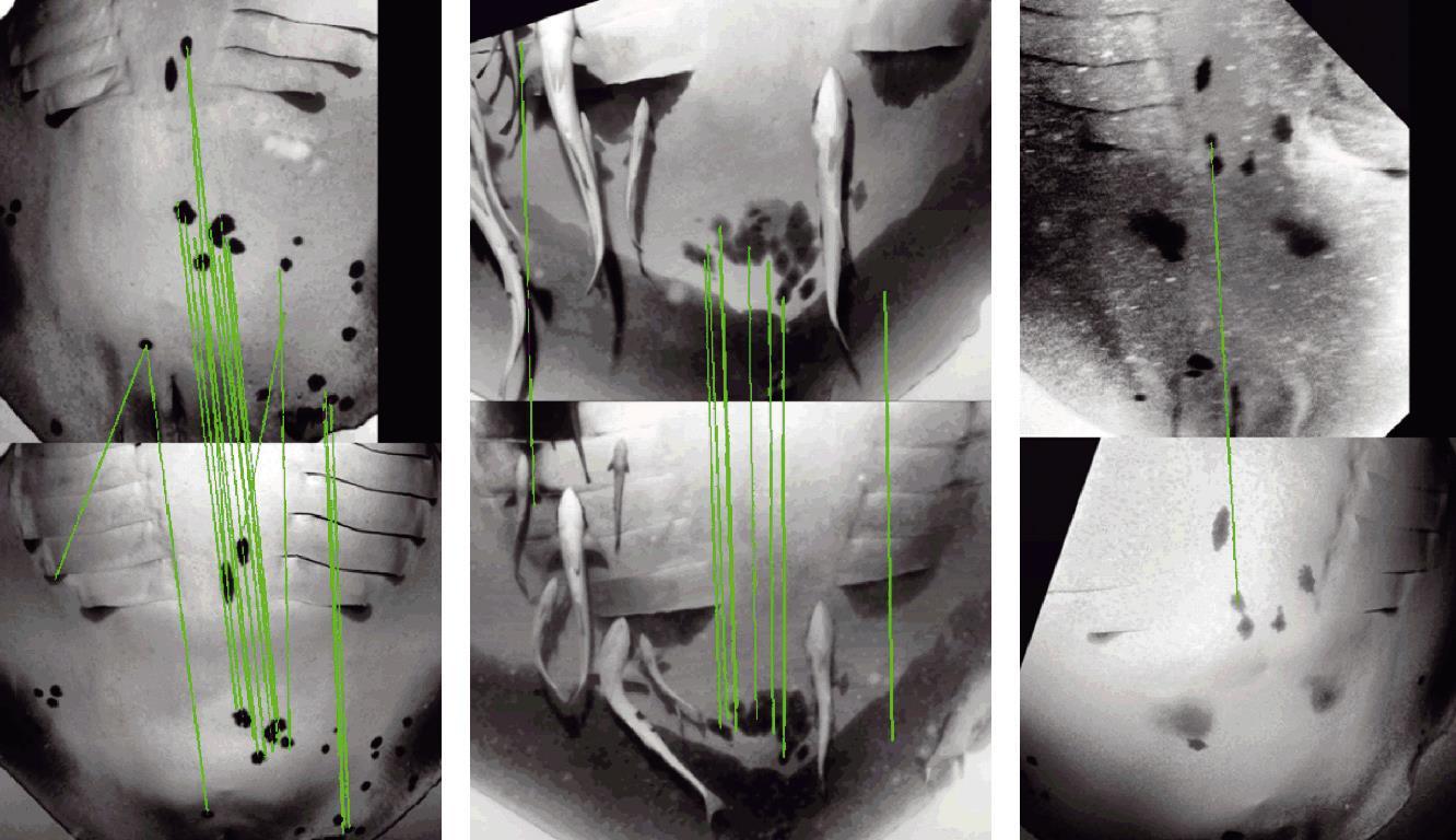 Примеры удачной работы программы по идентификации брюшных рисунков мант: совпадения подобраны верно. Изображение из статьи C. Town et al., 2013. Manta Matcher: automated photographic identification of manta rays using keypoint features