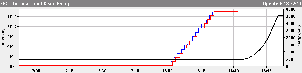 Если говорить более точно, то столкновения происходят не абсолютно непрерывно, а отдельными циклами «набор протонов — работа — сброс», которые по-английски именуются просто «fill». Каждый такой цикл работы начинается с инжекции — впрыскивания протонных сгустков из предварительного ускорителя в основное кольцо LHC по специальным линиям передачи Tl2 и Tl8, соединяющим два кольца (см. общую схему ускорителя). Магнитная система в LHC в этот момент настроена на удержание 450-гэвных протонов строго на орбите, но с помощью специальных быстрых магнитов, которые стоят на входе в LHC, физики «кладут» протонные сгустки на орбиту. Сгустки «кладутся» не в произвольные, а в специально выделенные моменты времени — так, чтобы не мешать уже циркулирующим протонам. Наконец, все эти сгустки, число которых при плановой работе достигнет 2808, инжектируются в LHC не единой «очередью», а отдельными «составами» по несколько сгустков за раз. Вся эта процедура занимает несколько десятков минут; отслеживать ее в реальном времени можно на главном онлайн-мониторе LHC, где на центральном графике красным и синим цветом показана интенсивность обоих пучков (см. рис. 1).