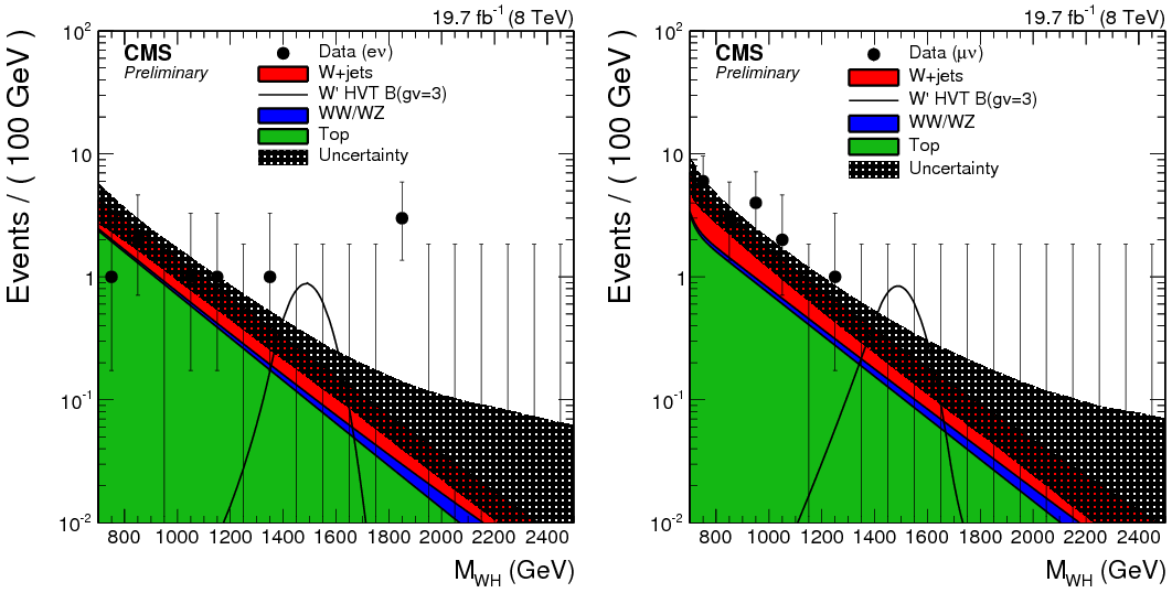 Коллаборация CMS провела поиск событий рождения WH-пар с инвариантной массой больше 1 ТэВ. W-бозон регистрировался по лептонному распаду, а хиггсовский бозон — по распаду на b-анти-b пару. В электронном канале распада обнаружено три события с MWH > 1,8 ТэВ, хотя СМ предсказывала всего 0,3 события, в мюонном — ни одного. Локальная статистическая значимость — 2,9σ, глобальная — около 2σ.