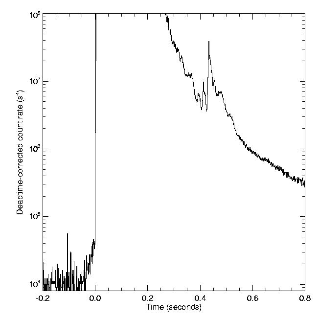 Всплеск 27 декабря 2004 г. по данным спутника Swift. Из работы Палмера и др. (D. M. Palmer et al.) astro-ph/0503030. По вертикальной оси отложено откорректированное количество отсчетов в секунду. По горизонтальной время от начала всплеска в секундах. Временное разрешение составило 1 миллисекунду!