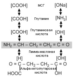 Если к выделенному цветом остову мысленно присоединить атомы в скобках, то получатся соединения, указанные в строчке. В природе распространены только L-изомеры производных глутаминовой кислоты, этот символ опущен. В реальных условиях жизни все эти соединения присутствуют в ионизированной форме