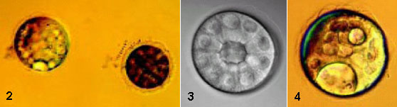 Выловленных в Ла-Манше самок типичных копепод северной Атлантики, а именно (именуем их, как принято у биологов, по-латыни) Calanus helgolandicus (произносится «калянус хельголяндикус») и Calanus brevicornis («калянус бревикорнис»), в экспериментальных условиях кормили диатомовыми водорослями, Thalassiosira rotula («талассиозира ротула»). По прошествии суток одно за другим появились шарики яиц: покрупнее — Calanus helgolandicus, помельче — Calanus brevicornis (фото 2, слева от последнего — цепочка диатомей). Обычно они прозрачны, и в них видны первые деления клеток зародыша (фото 3). Но странно, в яйце, которое отложила самка Calanus brevicornis, у мембран разделившихся клеток сосредоточен коричневый пигмент, которого обычно нет в нормальных, почти прозрачных, яйцах. А сами производительницы этих странных яиц побледнели, их тела потеряли красноватые вкрапления. В яйцах, отложенных самками Calanus helgolandicus, вместо одинаковых 2,4,8 клеток (в норме образующихся при дроблении) видны неправильные «мыльные пузыри» (фото 4).