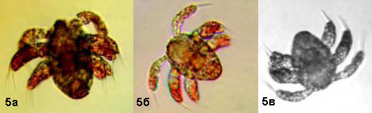 Прошли еще сутки. Из яиц Calanus brevicornis вылупились младенцы — науплии. Увы, они не похожи на нормальных сверстников (см. фото 1) и не проживут следующие 24 часа. Это несчастные калянусные Квазимодо (фото 5): их туловища толстоваты, конечности асимметричны. Вместо четких синхронных прыжков они неуклюже двигаются по спирали и вскоре замирают. Ну а что же с яйцами Calanus helgolandicus? А их уже и вовсе нет: к этому времени они... растворились.
