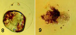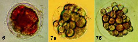 Тем временем самки копепод продолжали питаться диатомеями и откладывать яйца всё более уродливой и неправильной формы. Вот они, вариации аномальных яиц копепод после двух суток такого питания: происходят асинхронные клеточные деления; расслаивается и утончается (фото 6) эмбриональная мембрана; эмбрионы дорастают до 16–32 клеток, но делящиеся клетки не прилегают плотно друг к другу у зародышей как Calanus helgolandicus (фото 7а), так и Calanus brevicornis (фото 7б) — нарушаются адгезивные свойства клеточных мембран; внутри неправильно развивающихся яиц с отслаивающимися мембранами появляются неравномерные скопления коричневого пигмента (фото 8); образуются пузырьки газообразных веществ, выталкивающие яйца на поверхность, где они вскоре распадаются (фото 9).