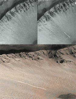 Перемещение больших масс грунта, вероятно песка, пыли и камней, по склону, происходящее в современную эпоху, иллюстрирует рис. 10. В нижней части снимка видны размытые валы осыпавшегося материала шириной около 3 км. Валы сыпучего материала огибают остатки прежнего рельефа, оставляя обнажённый склон. Такие же осыпи можно видеть и в других районах Марса; они известны со времён миссии «Викинга». Но значительно улучшенное разрешение фотокамер на новых космических аппаратах позволило обнаружить удивительные следы на склонах марсианских кратеров. Нельзя сказать, что образований, подозрительных в отношении наличия жидкой воды, раньше не замечали совсем. Но твёрдо установленная сухость и морозность марсианского климата заставляла исследователей искать ей альтернативу. Вначале предполагалось, что небольшие, но свежие изменения рельефа планеты объясняются большими осыпями мелкого песка и камнепадами на склонах глубоких долин и кратеров. Так возникли очень широкие и протяжённые овраги. Труднее было объяснить недавнее возникновение оврагов поменьше, да ещё и со следами каких-то потоков.