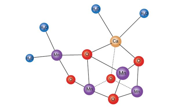 Структуру ФСII впервые исследовали немецкие ученые в 2001 году методом рентгеноструктурного анализа, однако получившаяся картинка была недостаточно качественной. «Карта» расположения атомов становилась все более точной, и, наконец, в 2011 году японцы достигли разрешения 1,9 ангстрем. Стало известно точное положение каждого из атомов кластера Mn4CaO5 — активного центра, где образуются молекулы О2 («Nature», 2011, т. 473, № 7345, с. 55–60). Вопреки распространенному среди небиологов мнению, они делаются из кислородов воды, а не углекислого газа. Кластер находится внутри белкового комплекса, огромного по сравнению с ним, «подвешенный» водородными связями к определенным аминокислотным остаткам. Теперь мы знаем, что атомы кластера образуют нечто вроде куба с боковым выростом, причем его кислороды выступают в роли мостиков, соединяющих атомы металлов (см. рис.). В статье японских исследователей рассказывается и о других интересных участках сюрреалистического лабиринта под названием ФСII. Куда там компьютерным играм...